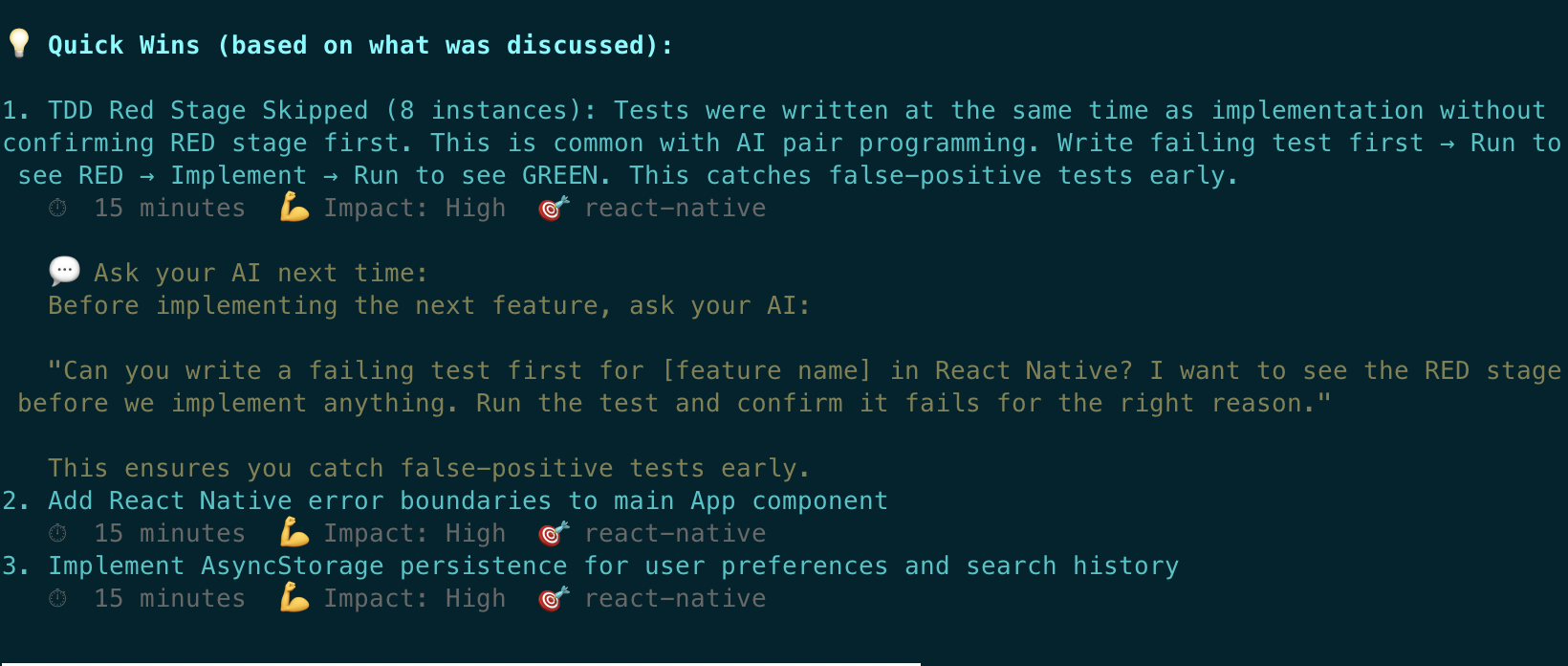 Real example: Detects TDD discipline issues and provides copy-paste prompts for your next session. Click to enlarge.